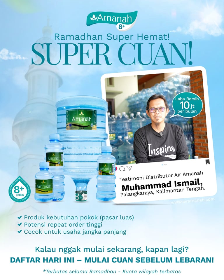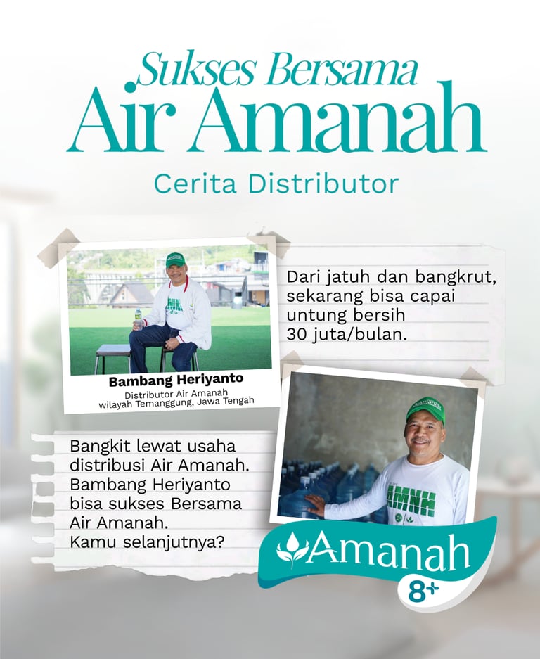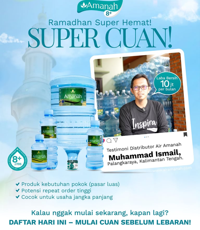 Air minum adalah salah satu kebutuhan harian dengan repeat order yang tinggi. Air Amanah membuka peluang usaha bagi siapapun yang ini meraih kesuksesan dalam bisnis Air Minum Dalam Kemasan (AMDK). Ambil peluang untuk menjadi pengusaha air minum dengan menjadi "Distributor Air Amanah". Dapatkan keuntungan dan fitur menarik untuk distributor antara lain :